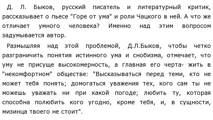 Проблема истинного ума по тексту Д.Л.Быкова (Гиа по русскому)![]() Также писатель, чтобы показать особенность умного человека, подчеркивает мнение Грибоедова в необходимости уму отклика. Дмитрий Львович пишет: " А ум рассыпает цветы своего красноречия где захочет- ему ведь нетрудно". Таким образом, на этих примерах, дополняющих друг друга, Баков отмечает особенности истинного ума. Автор считает, что умного человека отличает вечное и обреченное желание найти понимание. Я согласна с мнением Д.Л.Быкова, действительно, настоящий ум жаждет найти понимания в обществе, делиться знаниями. Более того, я считаю, что человека, проповедующий свое мнение, подтверждая его фактами, никогда не сможет быть понятым в чуждом для него общетве, как бы он ни доказывал свою правоту. Для подтверждения своей позиции приведу пример из читательского опыта. Наиболее ярким примером такого человека является Пьер Безухов, герой романа-эпопеи Л.Н.Толстого "Война и мир". Молодой граф, недавно прибывший в Петербург из Франции, попадает на вечер Анны Павловны Шерер. Не зная правил поведения в этом "искусственном" обществе, Пьер яро вступает в спор с гостями о том, "... что план аббата был химера", не стесняясь высказывать свою точку зрения. И, даже если Безухов подтвердил бы эту позицию миллионами фактами, логическими выводами, он все равно не был бы понят обществом, потому что его представители существовали согласно незыблемым правилам, устоявшимся канонам, и не принимали иного мнения, отличного от того, о котором принято было говорить. Ум Пьера все так же ищет почвы для размышления, но, увы, никогда не будет понят в чуждом для него обществе. Таким образом, опираясь на мысль исходного текста, можно сделать вывод, что истинный ум, живя в "некомфортной" для него среде, желает высказываться, "рассыпать цветы красноречия", при этом получать одобрение со стороны этого общества, однако добиться своего он не сможет. Обновлено: Опубликовал(а): марина ялунина Внимание! Спасибо за внимание.