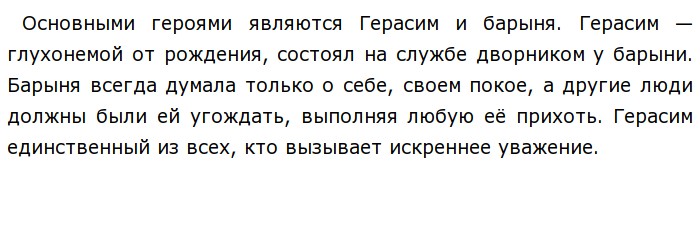 А барыня показана как деспотичная старуха, которая, пользуясь страшным правом вершить судьбу подвластных ей людей, загубила несколько жизней. Своими действиями она причинила тяжкие страдания и боль, лишив их права на простое человеческое счастье! В первом случае — она не дала пожениться Герасиму и Татьяне, а во втором — лишила Герасима его любимой собачки Муму. Герасим вынужден был избавиться от Муму по приказу барыни. Он берет Муму с собой, отправляется на лодке на середину реки, привязывает к ней кирпичи, «отворачивается, жмурится и разжимает руки…» Муму умирает от рук Герасима, которого она любила больше всего на свете. Для него «самый шумный день был безмолвен и беззвучен, наполненный «мучительной скорбью и достоинством». Этот поступок ярко демонстрирует несправедливость окружающего мира. Именно этот трагический эпизод, для меня является самым тяжелым в рассказе. Эта событие, произошедшее в жизни Герасима, характеризует его, как одного из тех, кто хорошо знал свое место, место крепостного, готового «в точности» исполнить приказания барыни. В конце рассказа наступает момент, когда образцовый слуга, проявив неслыханную дерзость, самовольно уходит от барыни. Даже в тяжелых условиях своей подневольной жизни он сумел сохранить гордость и собственное достоинство, служа капризной и вздорной барыне, но, не прислуживая ей. Мне этот рассказ очень понравился, несмотря на то, что он эмоционально очень тяжелый. Эта история показывает нам, как Герасим будучи крепостным, обладал очень мощным для того времени внутренним стержнем, что, несомненно вызывает огромное чувство уважения к нему! Обновлено: Опубликовал(а): Klestik Внимание! Спасибо за внимание.