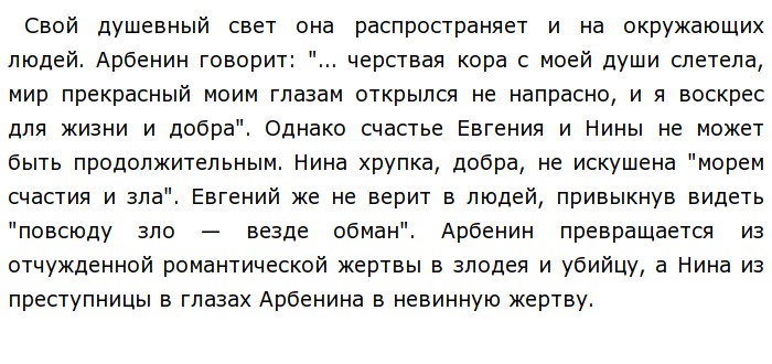 В этом состоянии безысходности Арбенин встречается с Ниной. Нина — воплощение доброты, чистоты души, любви, детской наивности. Она проста и естественна не только в домашнем кругу, но и в светском обществе. ![]()