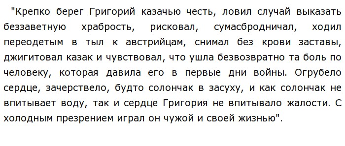 Цитатная характеристика Григория Мелехова по роману Тихий Дон (Шолохов М. А.)Григорий Мелехов - главный герой романа "Тихий Дон" М.А. Шолохова. Григорий - молодой казак, проживающий на хуторе Татарском, в станице Вешенская на берегу Дона. Семья Мелеховых не славится богатством, но живет в достатке, честно работая, продавая рыбу, убирая урожай. В семье Мелеховых трое детей: старший Петр, Григорий и Дуняша. Петр похож на мать, а Григорий очень походит на отца, но многое он взял и он бабушки-турчанки: ![]()