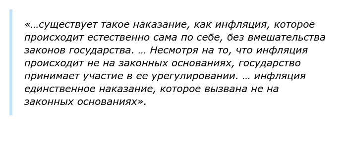 29.2 Экономика: «Инфляция — единственная форма наказания без законного основания» (М. Фридман) (ЕГЭ обществознание)Оценка эксперта внизу Автор имеет в виду, что существует такое наказание, как инфляция, которое происходит естественно сама по себе, без вмешательства законов государства. Обратимся к теории. Инфляция- это процесс обесценивания денег, который проявляется в виде долговременного повышения цен на товары или услуги. Она может быть вызванной по причине спроса или предложения, а также по темпу росту подразделяется на умеренную, галопирующую, и гиперинфляцию. Несмотря на то, что инфляция происходит не на законных основаниях, государство принимает участие в ее урегулировании. Государственное регулирование экономики- это совокупность мер , применяемых государством для регулировании экономики страны. Регулирование бывает прямым ( экономическое законодательство, применение норм, стандартов, лицензий и т.д) и косвенным ( фискальная, кредитно-денежная политика государства). Основными инструментами кредитно-денежной политики является сокращение/повышение денежной эмиссии, изменение ключевой ставки центрального банка, изменение нормы обязательных резервов, что может помочь при борьбе с инфляцией. Сложно не согласиться с автором. Если инфляция появилась естественно, то государство прилагает все усилия, чтобы свести ее к минимуму. Если же появление инфляции вызвана государством, его некорректными действиями и законами,то это приводит к огромному кризису, где товарно-денежные отношения находятся под угрозой. т.к. государство, пытаясь решить проблему, все больше ее усугубляет. В обосновании моей позиции приведу следующие аргументы. Хотела бы привести пример из СМИ. По телеканалу "Россия-24" передавали новость о том,что в связи со слухами о повышении цены на крупы, люди начали скупать крупу в супермаркетах и во всех оптовых точках, вслед за этим граждане начали скупать также и другие товары питания, что привело к повышениям цен. Однако государство вовремя приняло меры, возглавило борьбу с товарным дефицитом и опровергла лживые слухи. Данный пример подтверждает, что государство осуществляет борьбу с таким беззаконным наказанием, как инфляция. Второй пример можно привести из истории. После Великой Отечественной войны в СССР проводилась денежная реформа, но она была безуспешной. Из-за некорректности данной реформы, население обеднилось вдвое, люди начали голодать еще больше. В колхозах товарно-денежные отношения были заменены бартером, т.к. государство не могло обеспечить всех деньгами. Данный пример подтверждает, что иногда государство само принимает такие меры, из-за которых появляется инфляция. Таким образом, можно сказать, что автор был прав, когда говорил, что инфляция единственное наказание, которое вызвана не на законных основаниях. Обновлено: Опубликовал(а): Ekspert Внимание! Спасибо за внимание. Полезный материал по теме