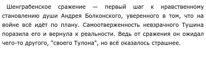 Каков путь исканий Андрея Болконского? по роману эпопее Война и мир (Толстой Лев Н.)В романе-эпопее Л. Н. Толстого "Война и мир" понятие "война" рассматривается в двух аспектах. Первый — вооруженный бой, враждебные отношения; второй — внутренняя борьба человека с самим собой, поиски смысла жизни, путь к истинному счастью. Такой путь исканий прошёл и один из главных героев произведения — Андрей Болконский. Впервые с ним автор знакомит нас в салоне Анны Павловны Шерер. Он скучает на приёме, ему не интересны сплетни и интриги, которые правят светским обществом. Князь Андрей оживляется, когда видит своего друга Пьера Безухова, чувствовавшего себя лишним в чужой среде. Болконский женат, позже он признается, что потерял интерес к супруге и даже заявляет, что брак не нужен. Он не любит женское общество, при встрече с Марьей и Лизой презрительно морщится и не разделяет их эмоций. Уходя на войну 1805 года, князь Андрей стремится сбежать от не удовлетворившей его, казавшейся ему бессмысленной жизни света; а также найти "свой Тулон", ведь он поклонялся Наполеону за его полководческий талант и желал испытать судьбу французского главнокомандующего. Чего же хотел он, к каим шел идеалам, какие цели ставил перед собой? "Хочу славы, хочу быть известным людям, хочу быть любимым ими". ![]()