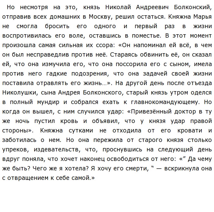 Анализ эпизода из романа «Война и мир» (Толстой Лев Н.)Эпизод «Смерть старого князя Болконского» является одним из самых знаменательных и важных в романе Льва Николаевича Толстого «Война и мир». Главными участниками этого эпизода являются княжна Марья и Николай Андреевич Болконский. Марья — это дочь князя Болконского, она всегда была послушной, беспрестанно молилась и глубоко веровала в бога. Её можно назвать «божьим одуванчиком», так как она никогда и никому не причиняла зла, уважала отца и отгоняла от себя плохие мысли, стараясь очистить свою душу. Сам князь был очень строгим, пунктуальным и даже в некоторой степени жестоким человеком. Он любил свою дочь, но из-за собственного характера не мог ей об этом сказать. Николай Андреевич проявлял свою любовь в безграничной требовательности к дочери и постоянных упрёках в её сторону. Это нежное чувство было настолько велико и несвойственно его характеру, что постепенно оно перерастало в злобу к Марье и даже ненависть. Основные события этой главы начинаются с того, что французы, заняв Смоленск, направляются вглубь России, и поэтому под угрозой нападения находятся все поместья, находящиеся на их пути. Лысые Горы не стали исключением. ![]() Именно это противоречие в её душе и составляет основу эпизода. Она всю жизнь старалась любить и уважать своего отца и никогда не упрекала его ни за что, но с каждым днем его издевательства копились у неё в душе, и в итоге всё это превратилось в желание его смерти, которое ей самой отвратительно: «Княжна Марья остановилась на крыльце, не переставая ужасаться перед своею душевною мерзостью…» Находясь при смерти, Николай Андреевич позвал свою дочь к себе, чтобы наконец высказать ей, что творилось у него в душе, раскрыть ту огромную любовь, которая терзала его. Все эти чувства он выразил в единственном и первом ласковом слове к дочери: «”Спасибо тебе... дочь, дружок... за всё, за всё... прости... спасибо... прости... спасибо!..” — И слезы текли из его глаз.». Именно это событие и является центральным, оно всецело раскрывает этих двух персонажей, обнажает их душу перед читателем. На примере старого князя и его дочери автор показывает нам проблему неспособности некоторых людей выразить свои чувства к ближнему. Мы видим, что Николай Болконский любил свою дочь, но он сказал ей об этом слишком поздно, когда в её душе уже возникло то мерзкое чувство. ![]() Лев Николаевич Толстой понимает всю важность и остроту данной проблемы, и поэтому уделяет ей особое внимание. Он сделал всё, чтобы люди, прочитав эту главу, поняли, что не нужно мучать себя и прятать свои чувства от кого-то, а особенно от родных, иначе это может испортить жизнь не только вам, но и тем, кто находится рядом. Этот трагический отрывок произведения начинается с грубости отца к своей дочери, а заканчивается первым выражением его любви к ней и последующей смертью. В этом и заключается особенность начала и конца данного эпизода, они полностью противоположны друг другу, и именно поэтому они так сильно воздействуют на читателя в эмоциональном плане. ![]() Толстой мастерски воздействует на чувства читателя, заставляя его полностью проникнуться тем последним и самым главным диалогом между княжной и её отцом. Художественные приёмы также играют важную роль в достижении этого. Многочисленные эпитеты («гадкие подозрения», 