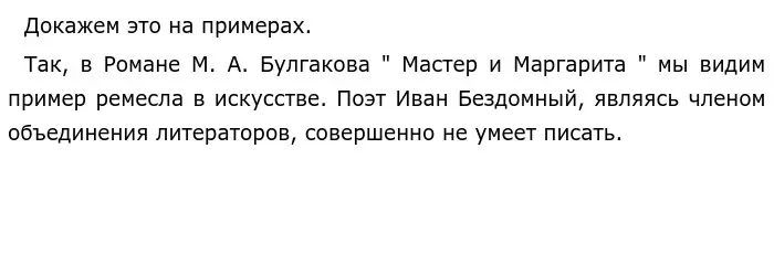 Таким образом, мне удалось доказать, что искусство и ремесло — это разные понятия. Главным их отличаем является цель, ради которой это все делается. Ремесло помогает человеку заработать и достичь определённых общественных благ. Искусство служит человеку средством выражения себя, своих возможностей, талантов. Настоящее искусство не делается ради денег и славы.