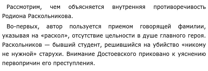 Чем же объясняется внутренняя противоречивость Родиона Раскольникова? (ЕГЭ по литературе)Роман Ф. М. Достоевского «Преступление и наказание» был написан во второй половине 20 века и относится к такому литературному направлению как реализм. В нём писатель поднимает множество важных и актуальных социальных, психологических и общественных проблем. Главный герой произведения сочетает в себе низкое и высокое, подлое и благородное. ![]() В произведении подробно описываются условия, в которых живёт Родион: крохотная комнатушка, с ободранными обоями, потрепанная одежда, дырявая шляпа… Ему приходится закладывать важные для него вещи просто чтобы выжить. Казалось бы, именно нищета должна была толкнуть его на преступление. Но причина его поступка намного глубже — будучи образованным человеком, задавленным социальной несправедливостью, он становится одержимым «наполеоновской» теорией. ![]()