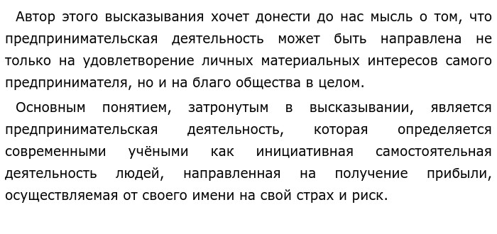 «Предпринимательская деятельность служит интересам не только индивидуума, но и общества в целом» (Канарейкин) (ЕГЭ обществознание)![]() В соответствии с потребностями рынка предприниматель принимает решение о том, что и как будет произведено. Экономические цели предпринимательства — максимизация прибыли при минимизации затрат. Фирмы в погоне за максимальной прибылью, стремятся повысить качество товара или же снизить цену, чтобы увеличить спрос. Это, безусловно, создаёт условия конкуренции на рынке. Другим производителям так же приходится повышать качество, зачастую используя новые технологии, что благотворно сказывается на развитии технологий в рамках целого государства. ![]() В качестве конкретного примера могу сказать о китайской компании «Huawei», выпускающей смартфоны нового поколения под брендами «Honor» и «Huawei». Техника этой компании отличается конкурентоспособностью и доступными ценами, по сравнению с мировыми лидерами, своими прямыми конкурентами. Рассмотрим, к примеру, последние модели таких брендов, как «Huawei» и «Apple», Huawei P30 Pro и iPhone 11 Pro соответственно. По характеристикам новенький iPhone уступает китайскому собрату, притом стоит на 45-50 тысяч дороже. Как итог, потребитель отдаёт предпочтение недорогому и более технологичному Huawei. Данная компания удовлетворяет и свои личные потребности, и потребности всего общества в целом, поставляя качественную и недорогую продукцию на мировой рынок. Вторым примером могут послужить различные государственные программы по поддержке предпринимательства. Принимаются новые федеральные законы, проводится стимулирование и защита малого и среднего бизнеса. Так, например, у Сбербанка есть программа поддержки начинающих предпринимателей, им предлагают кредиты на очень выгодных, к примеру сумму до 200 миллионов можно взять от 11% годовых. На примере этого банка видно, что предпринимательство очень важно для развития всего государства. Малый бизнес способен не только разнообразить ассортимент на рынке, но и предоставить рабочие места, что позволяет бороться с безработицей. Так явно видно, что, преследуя собственную выгоду, порой частные предприниматели способны решить некоторые проблемы государства и общества в целом. ![]() Обновлено: Опубликовал(а): Турушкова Екатерина Сергеевна Внимание! Спасибо за внимание. Полезный материал по теме