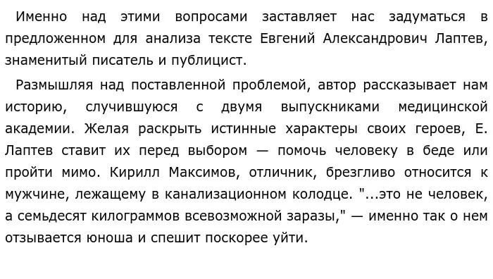 В противопоставление этому Е. Лаптев Описывает нам поступок другого героя, Артема Белякова, который не смог оставить другого человека в беде. Автор намеренно обращает наше внимание на то, что юноша, не боясь испачкаться или заразиться какой-нибудь болезнью, бросается на помощь незнакомцу. Именно в таком самоотверженном поступке проявляется характер Артема. Юноша стремиться помогать окружающим вне зависимости от обстоятельств. Так Е. Лаптев убедительно доказывает нам, что каждый врач должен обладать состраданием и жалостью.