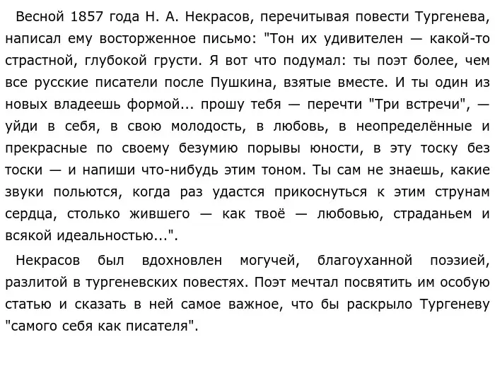 Психологической основой, содержанием тургеневских "студий" почти всегда становилось глубоко личное, пережитое ("это пережито", — любил повторять Тургенев, и в его устах такое признание звучало высшей похвалой). "Он не употреблял свой талант... на то, чтобы скрывать свою душу... — писал о Тургеневе