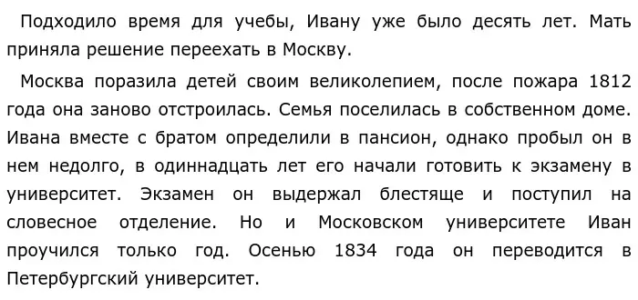 Иван Сергеевич Тургенев родился в дворянский семье, в которой власттвовала мать Варвара Петровна. Ей же принадлежали имение Спасское — Лутовиново и тысячи крепостных душ. Умная и образованная, она, тем не менее, была жестокой помещицей — крепостницей. В доме, который насчитывал около сорока комнат, для всех его обитателей, включая и детей, был установлен особый порядок. На каждый день маменька лично составляла расписание занятий. Детей подвергали наказаниям за его нарушение и малейшую провинность. Грамоте Ваню выучил крепостной Серебряков, с которым мальчика связывали дружеские отношения. Жизнь в детских комнатах протекала размеренно, однообразно, братья, их было трое, много занимались. В основном иностранными языками.