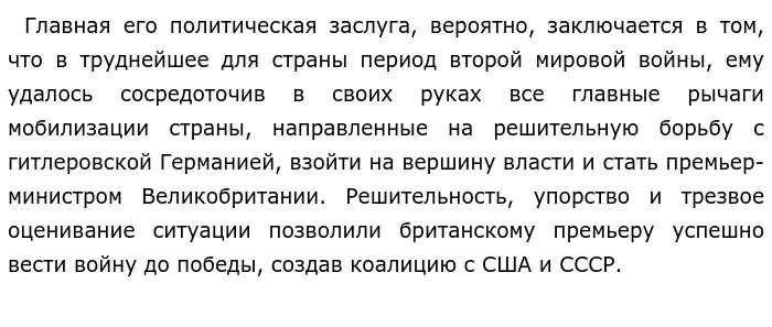 С другой же стороны, Уинстон Черчилль представляет нам государственного деятеля — патриота, который, в первую очередь, думает о народе и пользуется полученной властью не в корыстных целях, а для преобразования и процветания своей страны. К такому государственному деятелю, на мой взгляд, относится и сам Черчилль.