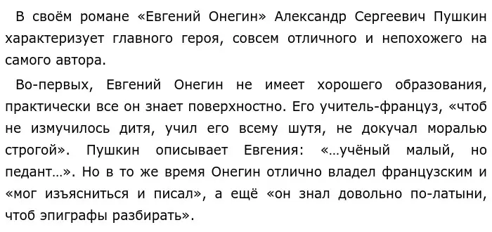 Но всё же Александр Сергеевич Пушкин и герой Евгений Онегин несмотря на некоторые сходства все равно в большей степени отличаются друг от друга своими внутренними качествами, своими мыслями и взглядами, поступками.