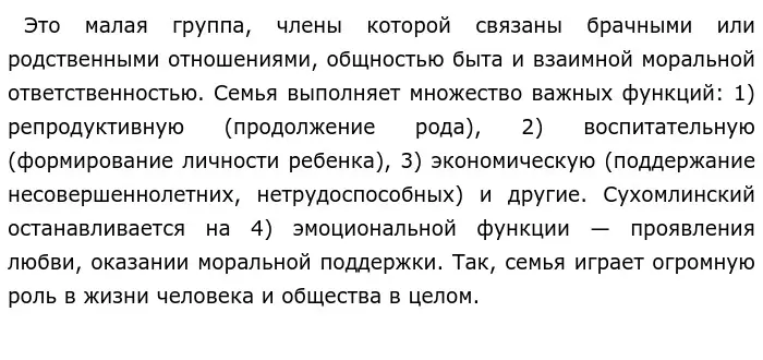 Каждая семья основана на системе взаимоотношений между супругами, родителями и детьми. Именно для поддержания этих взаимоотношений автор призывает уважать "мысли, убеждения, чувства, стремления" любимых. Всё это составляет мировоззрение человека — систему взглядов на мир и место человека в нем. Оно уникально, является частью личности и важно для каждого человека. Так же, из-за того что семья является первичным агентом социализации, поддержание благоприятной атмосферы в семье влияет на развитие ребенка и поэтому является одной из её главных задач. Таким образом, теоретические знания подтверждают правильность суждения Сухомлинского: для обеспечения гармонии семейных отношений необходимо уважать точку зрения, мировоззрение других. Это же применимо к большинству типов отношений между людьми. Обратимся к ряду аргументов для полного подтверждения слов автора.
