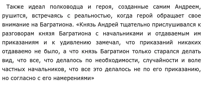 То же самое можно сказать и о других полководцах, которых Андрей Болконский изначально сравнивал с теми образами, которые выдумал себе сам. Герой разочаровывается, когда реальный образ Тушина перекрывает собой его идеализированную картинку. Тушина бранят за то, что он оставил орудия, но на самом деле никакого прикрытия и не было. Тушин, чтобы не подставлять другого командира, не сознается в этом. Но об этом знает князь Андрей. В голове Андрея совсем не вяжется образ Тушина в лице героя дня, он видит того маленьким и незначительным человеком, в то время как восхваляемый им Багратион оказывается совсем не героем.