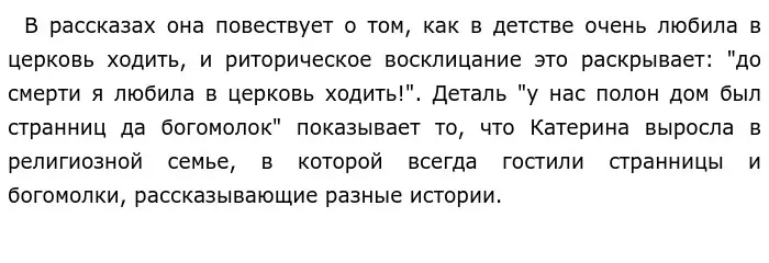 Таким образом, Катерина была глубоко верующей и свободолюбивой героиней. Эти особенности внутреннего характера нашли свое отражение в её рассказах.