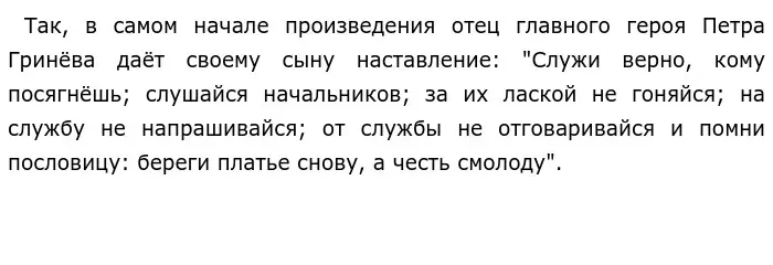 Преодолев все испытания судьбы, Пётр Гринёв вышел из них с чистой совестью, а самое главное — со сбережённой честью, как наставлял ему отец. На примере героического поведения Петра каждый из нас может получить для себя урок нравственности, заключающийся в том, что нужно, во что бы то ни стало, "хранить свою честь смолоду".