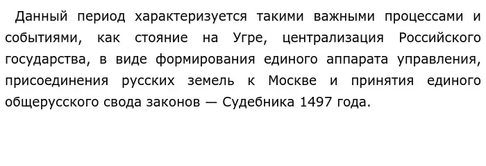 Также, действительно важным событием является принятие Судебника 1497 года. Причинами появления Судебника является усиление власти великого князя, возрастание роли боярства, появление единого аппарата управления государством (Дворец, Казна), устаревание положений Русской Правды, принятой в 11 - 12 веках - все вышеперечисленное вызвало необходимость принятия нового нормативно-правового акта, отвечающего вышеуказанным реалиям. Как итог, Судебник 1497 года закрепил основные нормы существования единого государства.