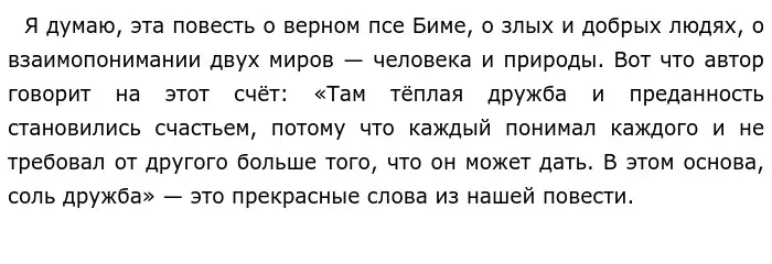 Я прочитал повесть «Белый Бим Чёрное ухо» Гаврила Николаевича Троепольского. Она заставила меня о многом задуматься, например, о привычных нам вещах — об отношении людей к братьям нашим меньшим. Они — о верной дружбе Бима с хозяином, ведь даже когда у Ивана Ивановича случился приступ, Бим до последнего вздоха царапался в дверь фургона, потому что почуял беду. Мы все знаем, насколько собаки преданные и верные существа, на что не способны некоторые люди… В книге присутствуют как добрые, так и злые представители человеческого рода. Злые люди здесь играют немаловажную роль. Это Тётка, которая притворилась, что Бим её укусил, Серый, который закрыл у себя в квартире и удалил пса палкой, Клим, который взял с собой на охоту и пнул в живот. Все они отталкивают читателя и вызывают у него сострадание к бедному Биму. Но, как говорится, нет худа без добра. Добрые люди здесь те, которые в чем-то помогли Биму на его хотя и собачьем, но трудном пути. Например, это Степанов с сыном Алешей, которые оказали усилие в поиске жилья и питания для домашнего любимца и Даша, которая отвела его домой.