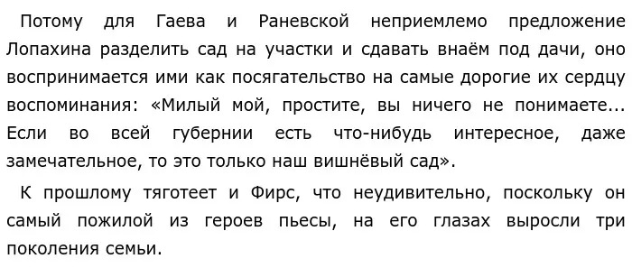 A вот Петя Трофимов видит прошлом лишь несправедливое и оскорбительное для человеческого достоинства социальное устройство. «Неужели с каждой вишни в саду, скаждого листка, скаждого ствола не глядят на вас человеческие существа, неужели вы не слышите голосов», говорит он Ане, призывая её оторваться от
