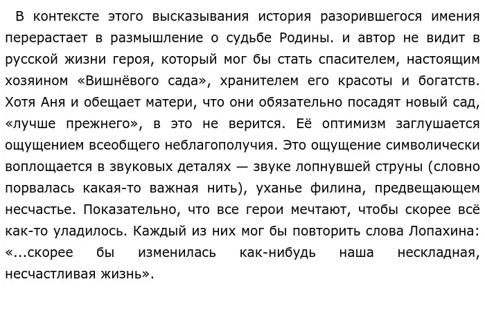 Символический смысл имеет вишнёвый сад и для его нового владельца Лопахина, ему важно стать не просто хозяином земли, которая может приносить доход, а купить именно это Имение, где его дед был крепостным. Это своеобразный знак успешности жизненного пути Лопахина, того, как много удалось добиться мальчику,