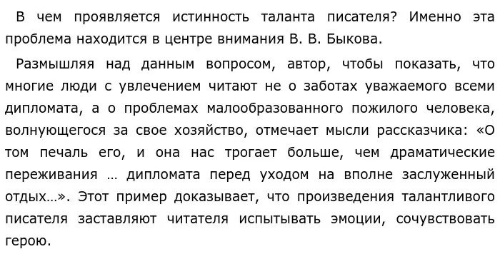 В. В. Быков считает, что истинность таланта писателя проявляется в способности правильно выбирать персонажа, который вызывает эмоции в читателях, в стремлении заставить человека испытывать те же чувства, что и герой произведения.