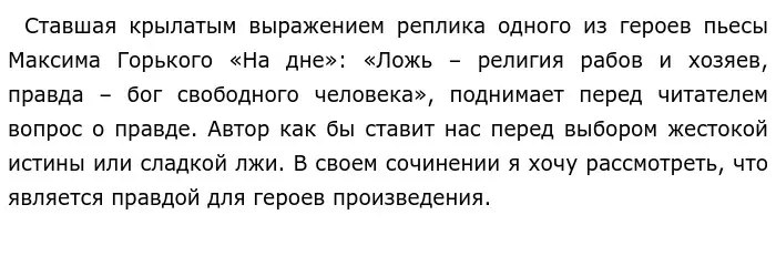 Именно Сатину принадлежит ставшая крылатым выражением реплика. Герой, однако, не замечает, что все обитатели ночлежки — «рабы»: голода, нищеты и своих пристрастий. Оказавшись на социальном дне, они вынуждены подчиняться обстоятельствам и практически не могут ничего контролировать самостоятельно. Даже те персонажи, которые в начале пьесы выражали свое недовольство философией Луки, вынуждены в конце концов согласиться с героем – правда хороша и ценна для тех, кто свободен и силен. Герои же слабы душевно и истерзаны физически, они запутались в жизни и находятся на грани выживания. Для многих из них вера, обретенная при общении с Лукой, становится спасительной, а сладкая ложь зажигает искру надежды в их измученных испытаниями жизни душах: Актер даже собирается найти лечебницу, где ему помогут избавиться от его алкогольной зависимости, а вор Васька Пепел — уехать в Сибирь с Наташей, чтобы начать новую, законопослушную жизнь. Тяжело больной жене Клеща Анне утешения Луки помогают просто спокойно принять смерть.