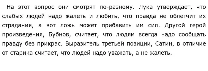 Таким образом, своими обещаниями Лука делает существование многих героев более светлым. Хотя не все его уверения правдивы, старик в первую очередь заботится о чувствах окружающих. Не всем персонажам нравится его позиция, так, Клещ и Сатин долгое время скептически относятся к изречениям героя. Этим персонажам удается не замечать своего бедственного положения, но и они, скорее всего, в душе согласны с мудрецом. Об этом свидетельствуют слова, произнесенные Сатином в финальном, четвертом действии пьесы: «Старик — не шарлатан! Что такое — правда? Человек — вот правда! Он это понимал «…» Он подействовал на меня, как кислота на старую и грязную монету».