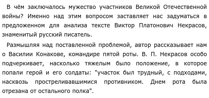 Я не могу не согласиться с мнением В. П. Некрасова. Действительно, каждый из нас может лишь поражаться отваге, которую проявляли участники войны. Так, всем нам известно о подвиге Александра Матросова, закрывшего своим телом дзот, спасая товарищей от вражеского огня. Мужчина решил отдать свою жизнь ради спасения других, показывая нам пример настоящего мужества.