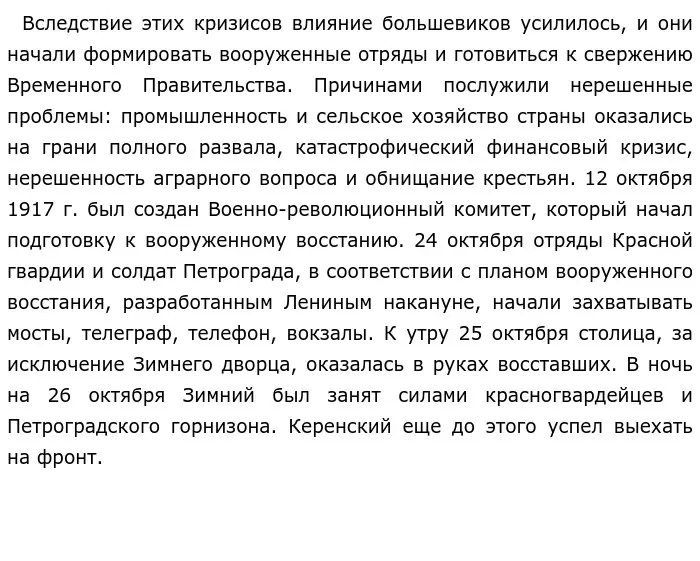 В начале 1917 года обстановка в стране складывалась непростая: нерешенность крестьянского, рабочего и национального вопросов, неудачная кадровая политика Николая II, неудачи на фронтах Первой мировой войны. Все вместе взятое явилось причинами Февральской буржуазно-демократической революции. Началось все с забастовки на Путиловском заводе: затем вследствие перебоев с поставками продовольствия в Петроград, 23. 02 женщины вышли на демонстрацию с требованием хлеба, возврата мужей с фронта. Позже к демонстрации присоединились рабочие. Через несколько дней забастовка переросла во всеобщую стачку. В ответ на революционную активность народа, депутаты Государственной Думы, которые не подчинились императору, добились отречения Николая II от престола, то есть свергли действующую и власть и монархию. Для управления столицей и государством они создали Временный исполнительный комитет членов Государственной думы во главе с М. В. Родзянко. Одновременно с образованием Временного правительства в Петрограде формируется Совет рабочих и солдатских депутатов, руководство которым оказалось в руках меньшевиков и эсеров, так как большевики подверглись репрессиям со стороны правительства Николая II в силу своего отрицательного отношения к войне. Таким образом, в стране победила буржуазно-демократическая революция и в стране сложилась система двоевластия: власть находилась в руках Временного правительства, а сила была в руках Петроградского совета рабочих и солдатских депутатов. Князь Львов, будучи главой Временного правительства, способствовал принятию демократических законов: освобождение всех политзаключенных, создание милиции, введение хлебной монополии, свободы слова, собраний и демонстраций. 18 апреля Милюков (министр иностранных дел) обратился с нотой к правительствам союзных держав, что Временное правительство не намерено останавливать военные действия на фронтах, и будет продолжать войну до победного конца, то есть, несмотря на демократические преобразования, правительство откладывало решение насущных вопросов о мире и о земле до лучших времен. Курс на продолжение войны повлек за собой первый кризис Временного правительства (апрельский), но оно сохранило свои позиции благодаря поддержке меньшевистско-эсеровского Петрсовета. В результате Гучков (военный министр) и Милюков ушли в отставку, а лидеры кадетов и октябристов предложили меньшевикам и эсерам войти в состав Временного правительства, вследствие чего было образовано коалиционное правительство.