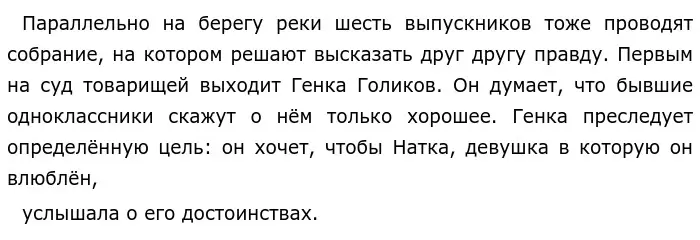 Получается же совсем по-иному. Генке припоминают какие-то давние обиды, называют его себялюбцем, говорят, что хорошие поступки он совершает исключительно напоказ. Юля Студёнцева, Вера Жерих, Сократ Онучин, Игорь Проухов и Ната Быстрова объявляют настоящую войну Генке Голикову. А на войне, как известно, все средства хороши. Выясняется, что Яшка Топор, местный бандит, планирует серьёзно проучить Генку. Сократ знал об этом и хотел предупредить его. Теперь же он не собирается этого делать, и все, кроме Юли, сним согласны. Юля пытается доказать обидевшимся товарищам, что это подло. А если встреча Топора и Генки закончится убийством? Постепенно сознание молодых людей проясняется, они начинают понимать, что могли стать соучастниками преступления. И в этой ситуации, когда каждый опять пытается себя оправдать, Юля говорит: «Не лги... Никто из нас ничего не чувствовал... И я тоже... Каждый думает только о себе... и ни в грош не ставит достоинство другого... Это гнусно... вот и доигрались...».