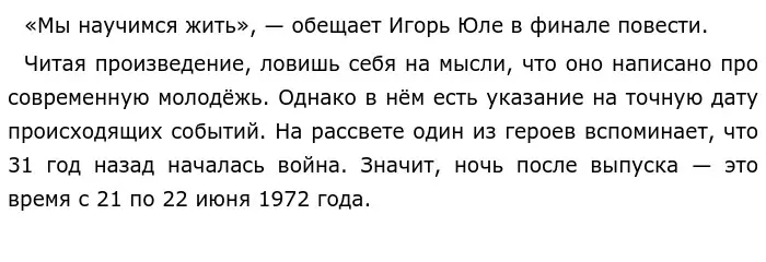 Таким образом, мы видим, что небольшая повесть «Ночь после выпуска» Владимира Тендрякова имеет серьёзную проблематику. Она заставляет задуматься, виноват в проблеме нарушения преемственности при передаче жизненных ценностей от одного поколения к другому. Финал произведения В. Ф. Тендрякова всё же вселяет надежду, что выпускники 1972 года способны вовремя признать свои ошибки и попытаться исправить их.