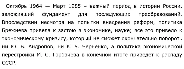 Октябрь 1964 — Март 1985 – важный период в истории России, именуемый «эпохой застоя». Он относится ко времени руководства Советским Союзом Брежнева, Андропова и Черненко. Тогда происходило множество разных событий, таких как: Косыгинская реформа и принятие конституции «развитого» социализма.