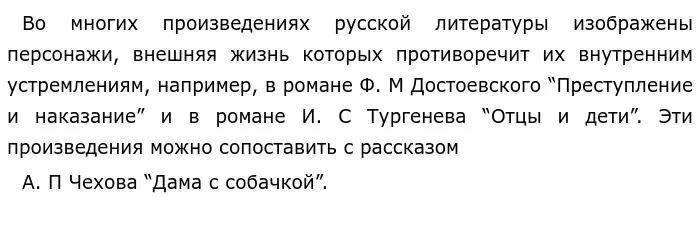 Соня Мармеладова занимается грязным делом - проституцией. Она это делает не с целью легкого заработка, а чтоб прокормить сводных братьев и сестер. Получается, что внешне она непорядочная, распутная женщина, но, на самом деле, она помогает материально своему отцу, духовно поддерживает Родиона Раскольникова, искренне верит в Бога. Что у Сони Мармеладовой, что у Гурова внешняя жизнь не соответствует внутренним стремлением, но различия их в том, что Соня не может изменить свою внешнюю жизнь.