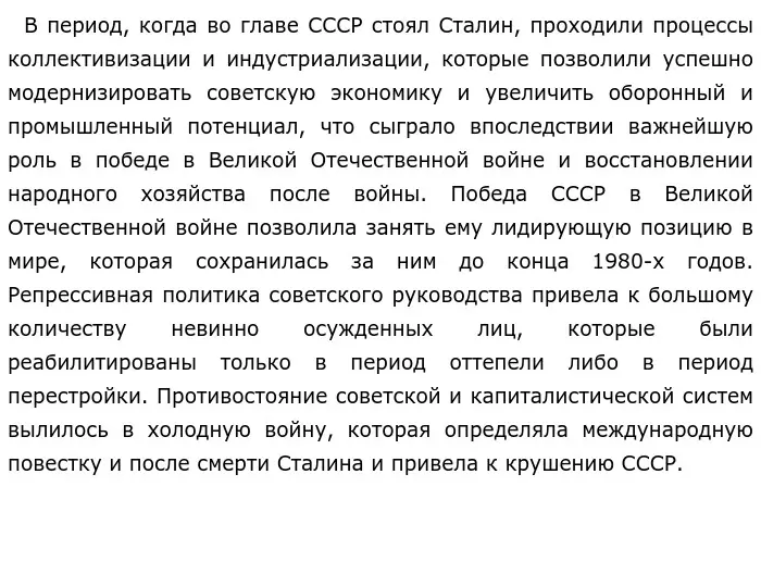 В апреле 1922 года на Пленуме ЦК ВКП (б) Сталин был избран Генеральным секретарем Центрального Комитета. Первые годы власть Сталина не была абсолютной: шла внутрипартийная борьба за лидерство, прежде всего, между Сталиным и Троцким. Сталин отстаивал идею построения социализма внутри одной страны, а Троцкий, наоборот, настаивал на мировой революции. Время правления Сталина ознаменовалось тоталитарным режимом и массовыми репрессиями. Однако, с другой стороны, Советский Союз, под руководством Сталина, одержал победу в Великой Отечественной войне, чем обезопасил мир от нацистского режима и поднял авторитет СССР на международной арене. Основные исторические события, явления и процессы: проведение индустриализации, вступление СССР в Лигу Наций, подписание пакта Молотова-Риббентропа, Великая Отечественная война, разработка ядерной бомбы СССР.