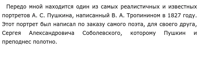 В. А. Тропинин вложил в этот портрет частичку своей души, скорее всего, именно из-за этого он потрясает не только поразительным сходством с оригиналом, но и неимоверной внутренней силой и проникновением внутренним миром Александра Сергеевича.
