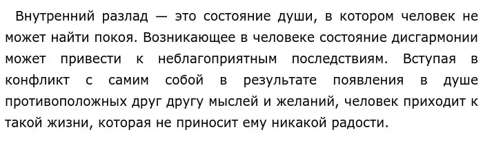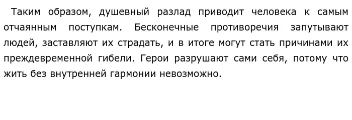 О том, что душевный разлад может привести к негативным последствиям, рассуждал и И. С. Тургенев в произведении «Отцы и дети». Евгений Базаров — нигилист, который отрицает любовь, природу и искусство. Молодой человек признаёт только ценность науки. Но его теория не проходит проверку жизнью. Так, отрицая любовь, Евгений Базаров влюбляется в Одинцову. Автор показывает конфликт ума, утверждающее, что любви не бывает, а «есть только физическое влечение», и сердце, которое не в силах... Душевный разлад приводит к тому, что главный герой мучится внутренними терзаниями: он не хочет признаваться самому себе, что его нигилистические воззрения оказались неверными, что они противоречат реальной жизни. И. С. Тургенев показывает, что истинный Базаров — этот тот человек, который способен любить. Несоответствие желаемого и действительного приводит героя к пониманию того, что только смерть способна принести ему облегчение. Герой из-за душевного разлада впадает в отчаяние, и уже не способен бороться за жизнь и за свои убеждения.