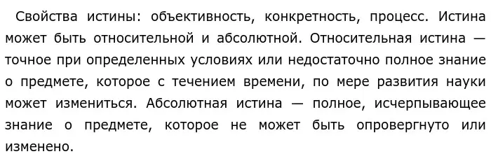 Из курса обществознания нам известно, что истина — утверждение или знание, которое точно (адекватно) воспроизводит окружающую действительность и соответствует свойствам познаваемого предмета. Для знания принципиально существенна его достоверность, соответствие познаваемому предмету, адекватное воспроизведение его свойств, выражаемое в понятии истины.