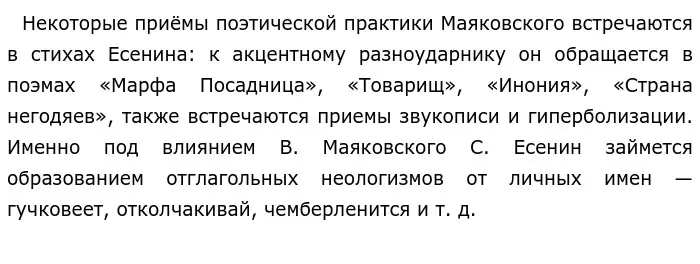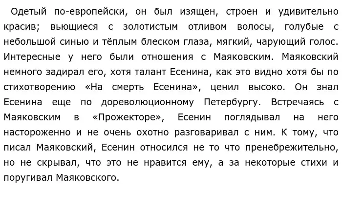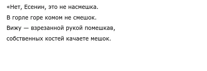 Если привести сюда Есенина, то он напротив, восхвалял и почитал Пушкина, его творчество и считал его родителем русского языка. Сергей Александрович просто верил в лучшее и желал лучшего крестьянам, но увидев то, что ничего не меняется, он поменял свое мнение. Он понимал, что жизнь народа превращается в «казарму военного коммунизма». Позже, он сильно раскаивался в том, что раньше поддерживал идеи революции.