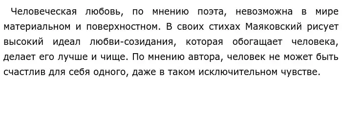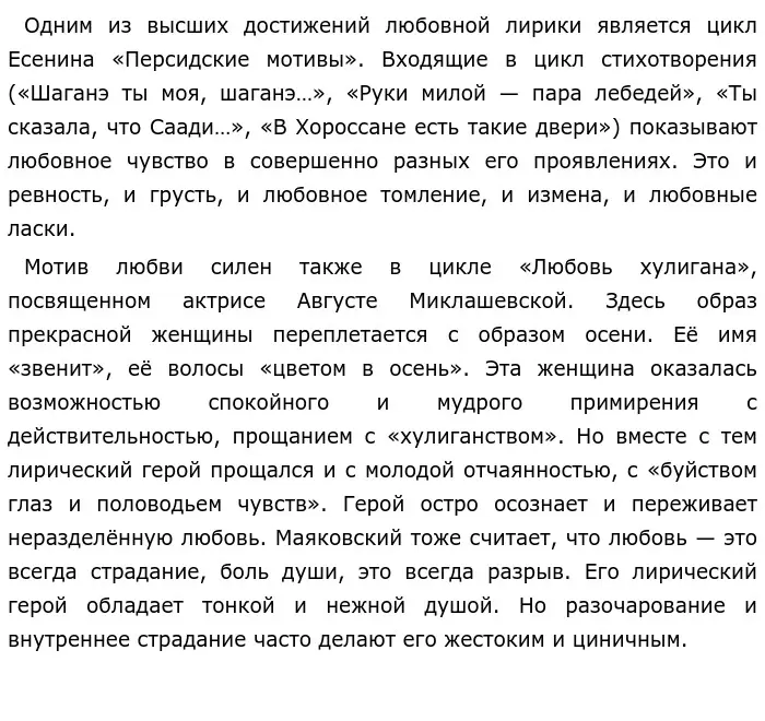 Сергей Есенин, влюблявшийся много раз, так и не смог найти любовь всей своей жизни. В его творчестве встречаются множество произведений, посвященных женщинам, одно из них, например, «письмо к женщине», где в образе лирического героя мы узнаем самого Есенина, который переживает расставание с любимой и душевные терзания. Важен финал стихотворения: поэт уверен, что забыть свою любовь он не в силах. Пусть она была безответна и мучительна, но в сердце навсегда останется её след, который будет греть душу поэта.