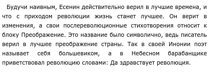 Именно таким образом Есенин отзывался о революции на расцвете своей творческой карьеры. Он по-настоящему горячо любил Россию и относился к ней с трепетом. Имея такие взгляды, поэт лишь желает для своей Родины лучшего. Стихи, которые поэт писал в начале своей карьеры, по содержанию были далеки от общественного движения. В них было много сказочного, былинного, но не было революционного порыва.