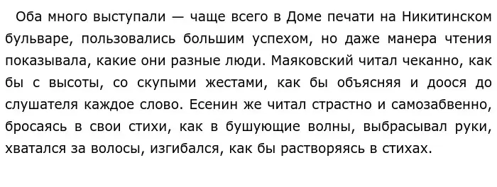 Две абсолютно разные личности, с разными взглядами на жизнь, не ладившие друг с другом все смогли найти общий язык. Они часто вздорили из-за разных мнений, часто не понимали и оскорбляли друг друга. Но тем не менее Маяковский всегда говорил о том, что Сергей Есенин талантливейший писатель и добьется многого. И всё же оба поэта понимали силу таланта друг друга. И именно Маяковский написал, пожалуй, один из самых пронзительных откликов на смерть поэта — стихотворение Сергею Есенину».