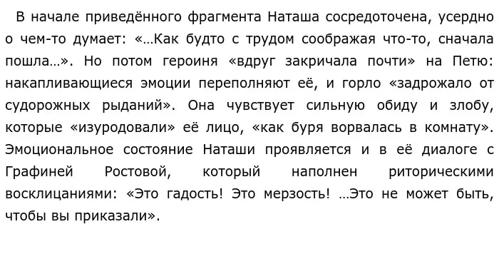 Обида и злоба Наташи вызваны несправедливостью сложившейся ситуации: Графиня Ростова приказывает не отдавать все подводы под раненных — она хочет спасти имущество семьи, пожертвовав при этом людьми:. Наташа — добрый и великодушный человек — не понимает, как возможно совершить такую «гадость» и «мерзость»: «Это такая гадость, такая мерзость, такая… я не знаю! Разве мы немцы какие-нибудь?». Как персонаж, близкий к народу, она понимает всю бессмысленность материальных ценностей в условиях войны и свой долг помочь как можно большему количеству раненых: «…Ну что нам то, что мы увезем, вы посмотрите только, что на дворе…».