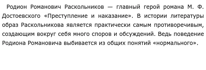Родион Раскольников показан Достоевским читателю как достаточно симпатичный молодой человек. «...он был замечательно хорош собою, с прекрасными темными глазами, темно-рус, ростом выше среднего, тонок и строен...». Однако выглядел он крайне потрепано и бедно, ходил в лохмотьях. К тому же, Родион был очень умен, будучи студентом он знал языки, переводил книги. Но при этом поведение Раскольникова кажется крайне безрассудным. Молодой человек пошел на преступление из-за мнимой теории: «Тварь я дрожащая или ПРАВО имею?». Многие поспорят, сказав, что на преступление Родиона подтолкнули тяготы бедной жизни, однако они, по моему мнению, окажутся неправы, ведь бедность породила лишь размышления о теории. Помимо заведомо неправильной, теория является еще и нездоровой с психологической точки зрения. Раскольников размышляет о праве на убийство, сравнивая себя в Наполеоном. Рассуждая масштабно, гонясь за мировыми целями, деля всех людей на два типа, Раскольников никак это не аргументирует. У него нет целей для этого деления, нет логики рассуждений, все крайне сумбурно и в какой-то степени даже глупо. Это дает понять, что Раскольников не просто бедный студент, готовый пойти на убийство, он является психически нездоровым человеком.