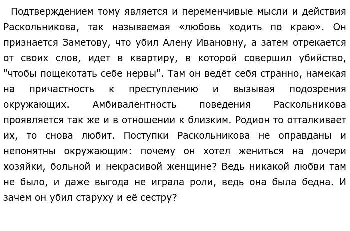 Достоевский называет Раскольникова мономаном — человеком, который одержим идеей, в данном случае теорией. Федор Михайлович дает понять, что не так проста природа поведения его героя. Галлюцинации, нервозность, амбивалентность, подозрительность, чрезмерная рискованность — всё это наталкивает, по моему мнению, на мысль о том, что Раскольников является шизоидом в психоаналитическом смысле. У Родиона есть жажда «доказать, что я не тварь дрожащая, а право имею». А кому он хочет это доказать? К примеру, нарциссы доказывают это всем вокруг, а шизоиды — себе. Это мы и видим в романе. Он хотел доказать самому себе, что он — человек. А шизоидным личностям свойственно в этом сомневаться. Таким образом можно сделать вывод, что поведение Раскольникова является результатом его психического расстройства.