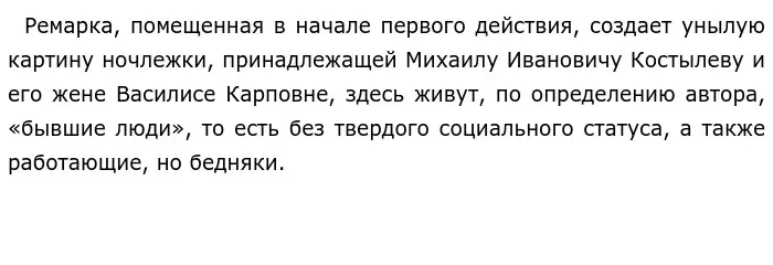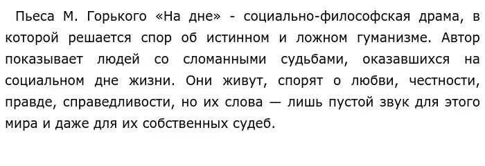 Таким образом, первая и последняя сцены пьесы М. Горького «На дне» неразрывно связаны между собой: существующие в унизительных условиях бедности равнодушные и ожесточенные герои, потерявшие какой-либо стимул к жизни, возвращаются к своему бессмысленному существованию и теряют надежду на светлое будущее.