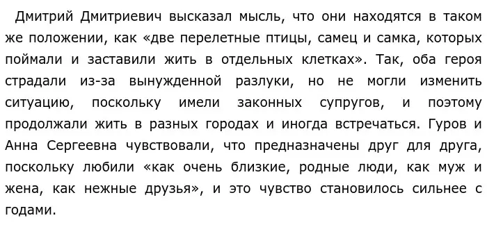 Таким образом, герои рассказа А. П. Чехова сравниваются с разлучёнными перелётными птицами, так как испытывают сильные чувства друг к другу, однако не могут быть вместе, так как находятся в браке.