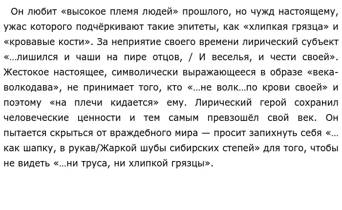 Таким образом, многие поэты 20 века показали в своём творчестве сложный характер отношения к современной им эпохе, однако каждый сделал это по-своему. В стихотворении О. Э. Мандельштама показано категорическое неприятие ценностей века, лирический герой произведения С. А. Есенина смиряется с наступлением новой эпохи, а А. А. Блок высказывает мысль о том, что жизнь в России всегда была тяжёлой.