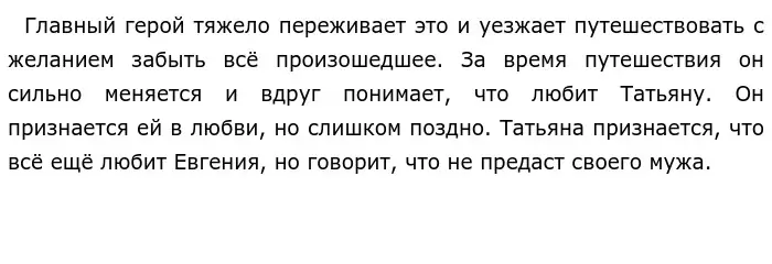 Вырос он довольно эгоистичным и самовлюблённым. Каждый день Евгений посещал балы и разные мероприятия, где проводились праздники и пиры. Одним словом, он был праздным человеком, для которого было важно провести свой каждый день с весельем. Однако, как это бывает, даже излишний отдых человеку надоедает, так и Онегину наскучивают данные мероприятия. Впоследствии он отправляется в деревню к умирающего дяде, чтобы "помочь" и отдохнуть от столичной суеты. Там он знакомится с Владимиром Ленским. Они постепенно сближаются и он знакомит Евгения с семье своей невесты — Ольги Лариной. Татьяна, сестра Ольги, с первого взгляда влюбляется в Евгения. И это было не удивительно, ведь его естественная красота и хорошие манеры всегда привлекали женщин. Однако, несмотря на то, что Татьяна отличалась своей скромность и застенчивостью от других девушек, она не вызывает у Онегину интерес. Не долго думая, она решается написать ему письмо, в виде признания. Онегин не испытывает никаких чувств к Лариной, поэтому, как мне кажется, он оправдывается тем, что ещё не готов к семейной жизни. Что касается Ленского, то можно сказать, что он не был с Евгением в тесных дружеских отношениях, так как Онегин поддерживал с ним общение, лишь из-за скуки и отсутствия другой компании. Вдруг, неожиданно для Ленского, Онегин начинает ухаживать за невестой Владимира. После чего разгорается конфликт и назначается дуэль. Мне кажется, Евгений понимал, что был не прав, но объясниться с другом не решился...