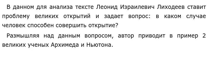 Противопоставляя данные примеры, Леонид Лиходеев приходит к мысли о том, что открыть что-то новое способен лишь тот, кто заинтересован в собственной жизни и жаждет познать окружающий мир.