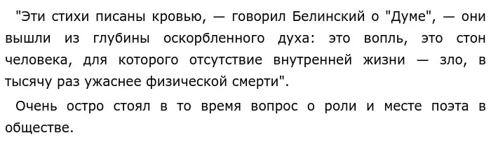 В 1838 году появилось стихотворение ещё более близкое по духу и мыслям к поэзии декабристов — "Дума". "Печально я гляжу на наше поколенье! Его грядущее — иль пусто иль темно", — так начинает поэт размышления о своих сверстниках. Поэт упрекает свое поколение в равнодушии и малодушии перед опасностью: