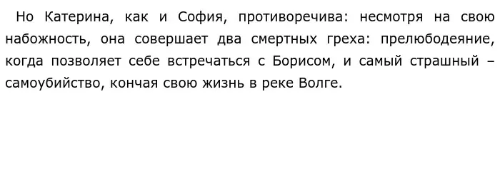 Образ Софьи Фомусовой из пьесы А. С. Грибоедова "Горе от ума" является одним из самых противоречивых в русской литературе. Она в свои семнадцать лет умна и начитанна, она способна понимать Чацкого и на равных отвечать ему. Софья – сильная девушка, умеющая сама принимать решения во многих делах. Она способна на глубокие чувства, не боится своего отца, понимая, когда он прав, а когда нет. То есть она отличается от лицемерного и корыстного Фамусовского общества. Тем не менее Софья – всё же его часть, все её привычки и планы на будущее связаны именно с устоями общества, в котором она родилась и выросла. Она не согласна с Чацком, не разделяет его взглядов, не понимает его недовольства московским дворянством. Софья живёт по установленным законам света и даже использует их против Чацкого, пустив сплетню о его сумасшествии. Героиня также выбирает в женихи Молчалина – «мужа мальчика, мужа - слугу», потому что так было принято в её среде, женщины руководили мужьями. Подтверждение этому можно найти в диалогах на балу. Тем неменее, Молчалин не вполне соответствует представлениям об идеальном женихе, установленным в Фамусовском обществе, ведь он не богат и не знатен. С Софией схожи и многие другие героини русской литературы. Так, например, Катерина из драмы А. Н. Островского "Гроза" – «лучик света в тёмном царстве», то есть героиня, как и Софья Фамусова, явно выделяется из окружающего её общества. Она более искренняя, добродетельная девушка, для которой на первом месте стоят духовные ценности. Она очень набожная, с самых ранних лет приучена молиться и в отличие от своего окружения делает это искренне.
